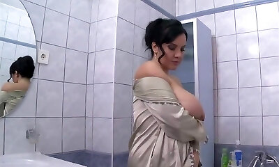 Horny milf fondles her big tits in a soapy bubble bath