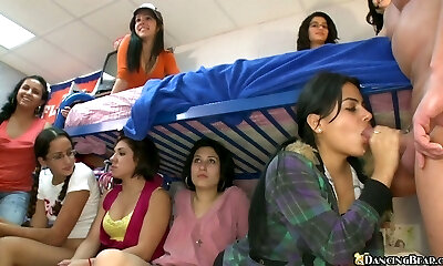 College girl is sucking a cock in front of her buddies until the guy cums packing her facehole with jizz